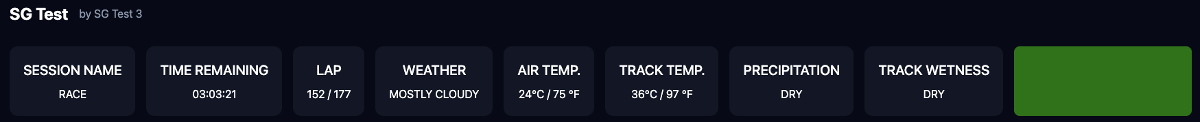 Next to the track temperature, there is large colored box. This box is the current flag state of the session. Most of the time, the box is green and therefore the session is green. Other possible flags could be yellow, white or checkered.