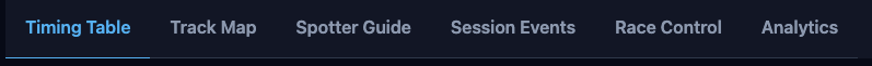 ViewerRoomTabsTabsEach room contains a series of tabs. The default and main tab is Timing Table. The following tabs are available:Timing TableTrack MapSpotter GuideSession EventsRace ControlAnalytics